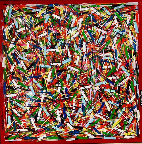 Sans hésitation, les matières côtoient les couleurs et nourrissent les formes géométriques. Le tissu, le cuire ou le métal peuvent venir soutenir la toile dans son relief. L’artiste va troquer le pinceau contre une truelle, un couteau ou tout simplement utiliser ses doigts s’il l’envie s’en fait ressentir. Très actif devant sa toile, il a besoin de prendre du recul, de laisser s’exprimer son geste et c’est pourquoi il préfère les grands formats aux petits, lui accordant plus de liberté.