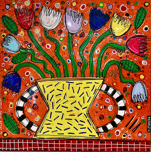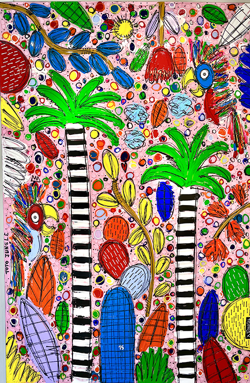 Recouvertes désormais d’un vernis brillant, les toiles se révèlent dans toutes leurs couleurs et leurs mouvements. Le visuel change au fur et à mesure de la journée, il pétille. Son œuvre et son parcours peuvent rappeler Basquiat pour certains points, source d’inspiration pour David Ferreira qui ne manque pas d’y faire référence dans ses œuvres.
