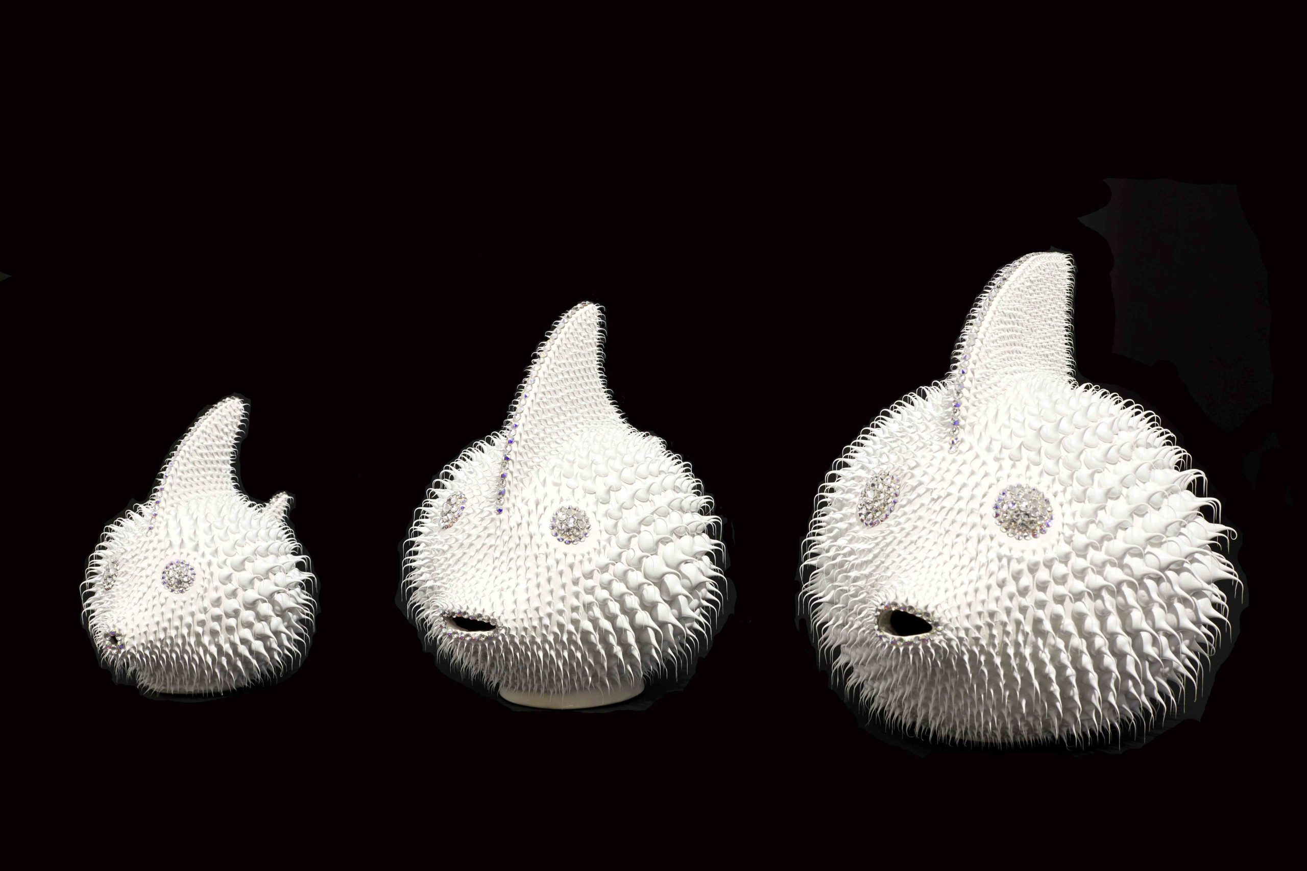 His technique was born in 2006 and developed since 2010. It consists of dressing her creations with hundreds or even thousands of silicone pegs. Each piece is worked instinctively without a plan or diagram. The eye and hand guess and follow the most expressive curves to give a life. This life, the result of the movement creates, creates, decreasing, intrigues and surprises the eye. Visually prickly but soft to the touch, they exude novelty.