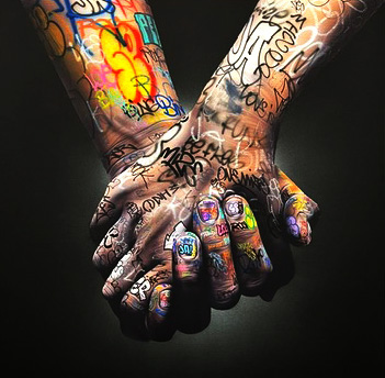 Ces œuvres représentent souvent une explosion de couleurs et de vibrations positives. Onemizer est connu pour l’utilisation de nombreuses techniques toutes différentes telles que les bombes aérosols, le pochoir, la pinceau, l’encre ou encore la paume de ses mains.